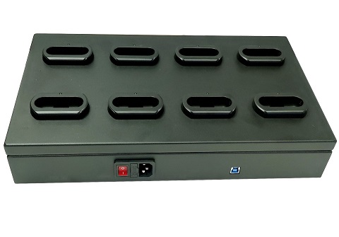 Док-станция ТМ0-8 использует для зарядки одновременно 8 устройств. Она подходит для Vizor-1, Vizor-3, Vizor-6. Корпус изделия создан из металла, у него есть интерфейс USB. устройство может работать только с компьютером т.к. полностью отсутствует собственная операционная система и печатная плата внутри.